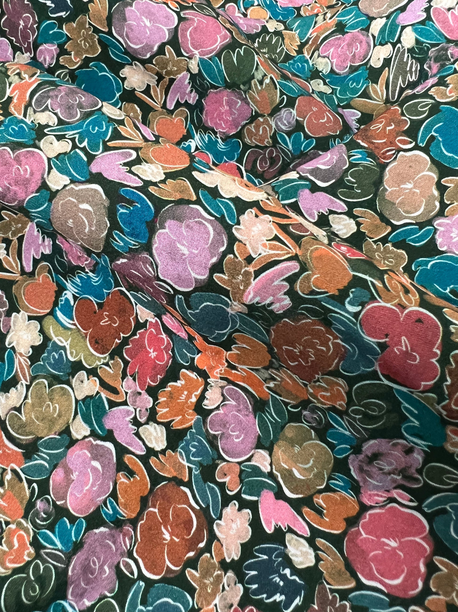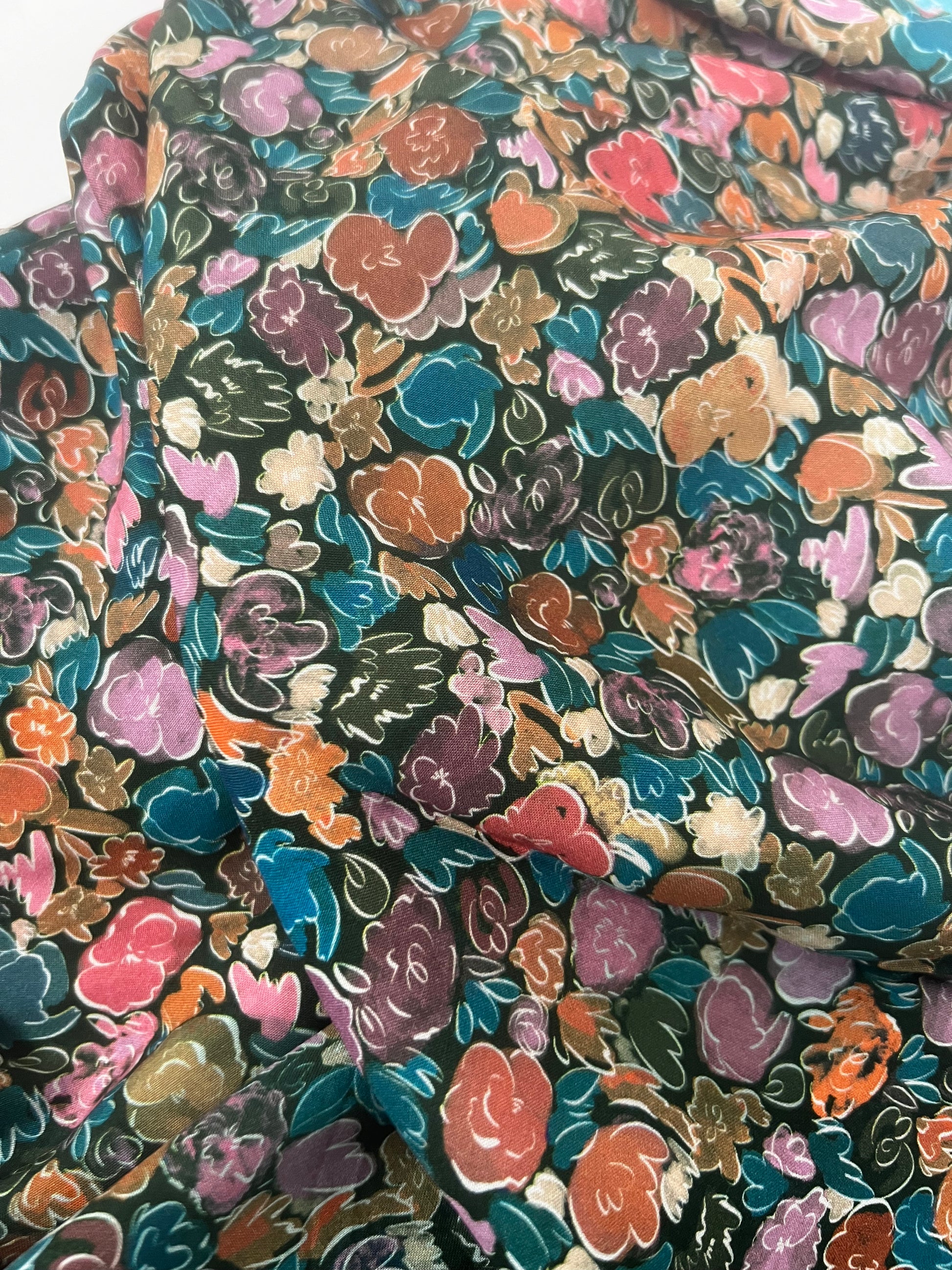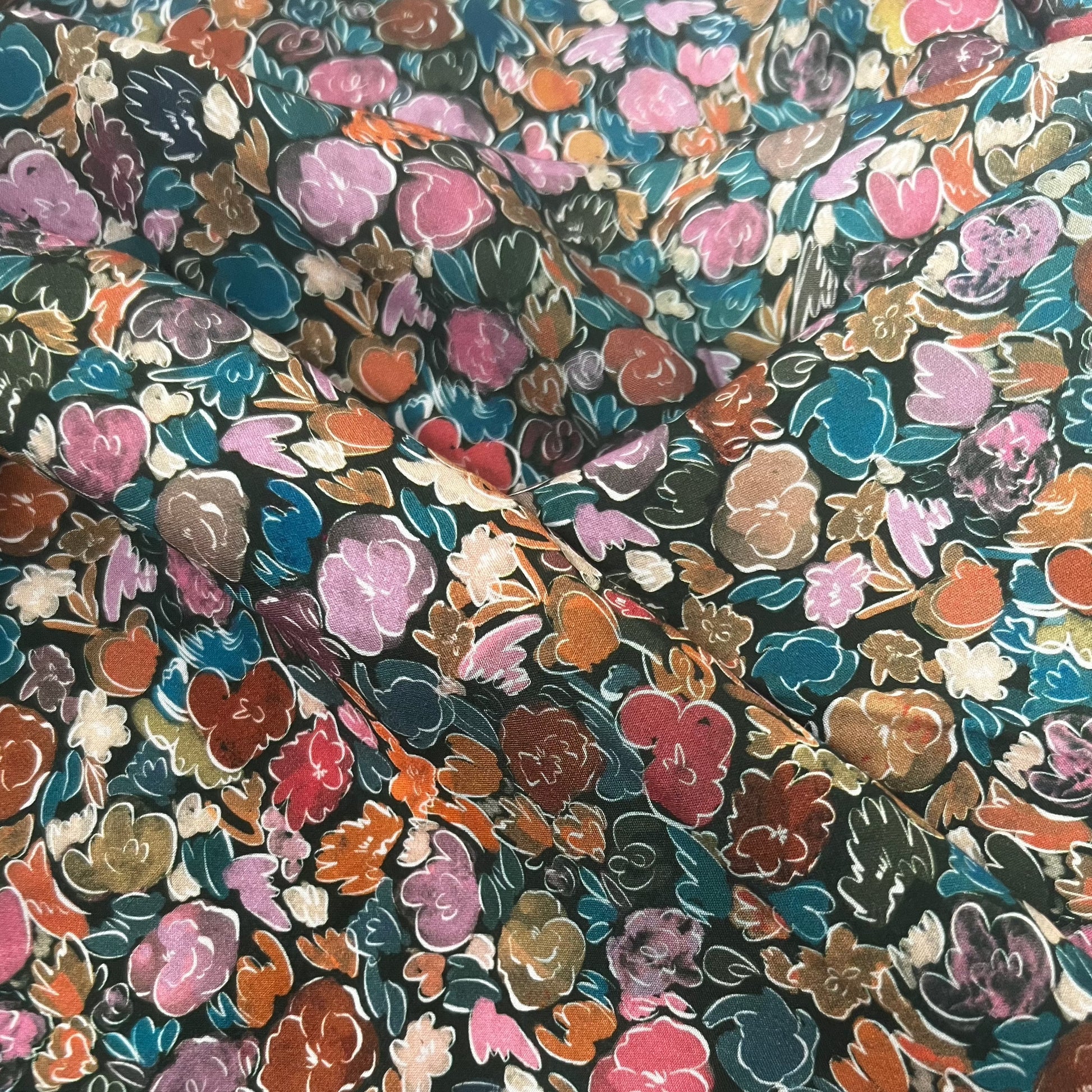 This lovely viscose fabric features delicate floral design in mostly shades of browns with hints of pinks, oranges and greens. This will make some delightful skirts, tops, dresses and more!