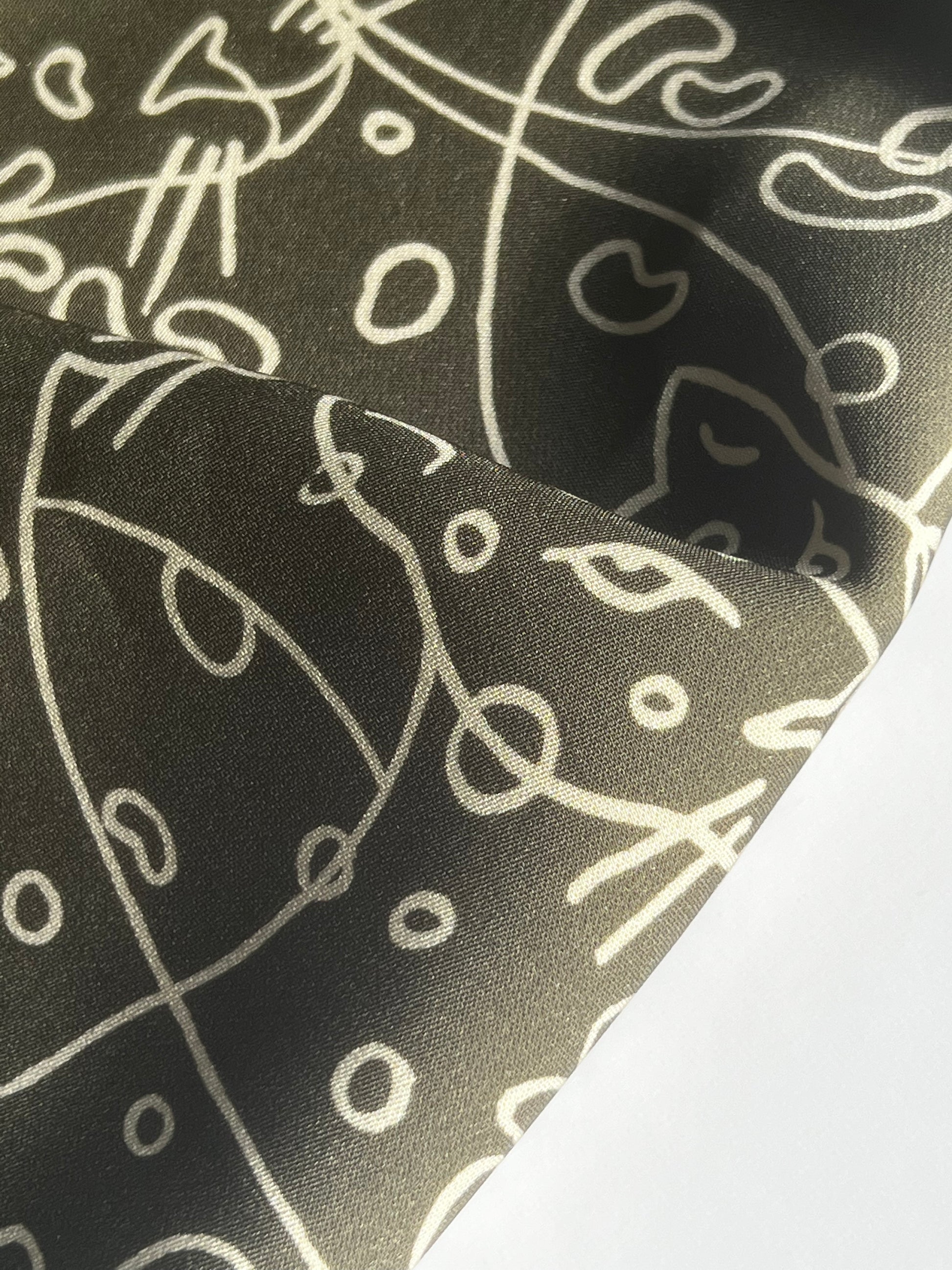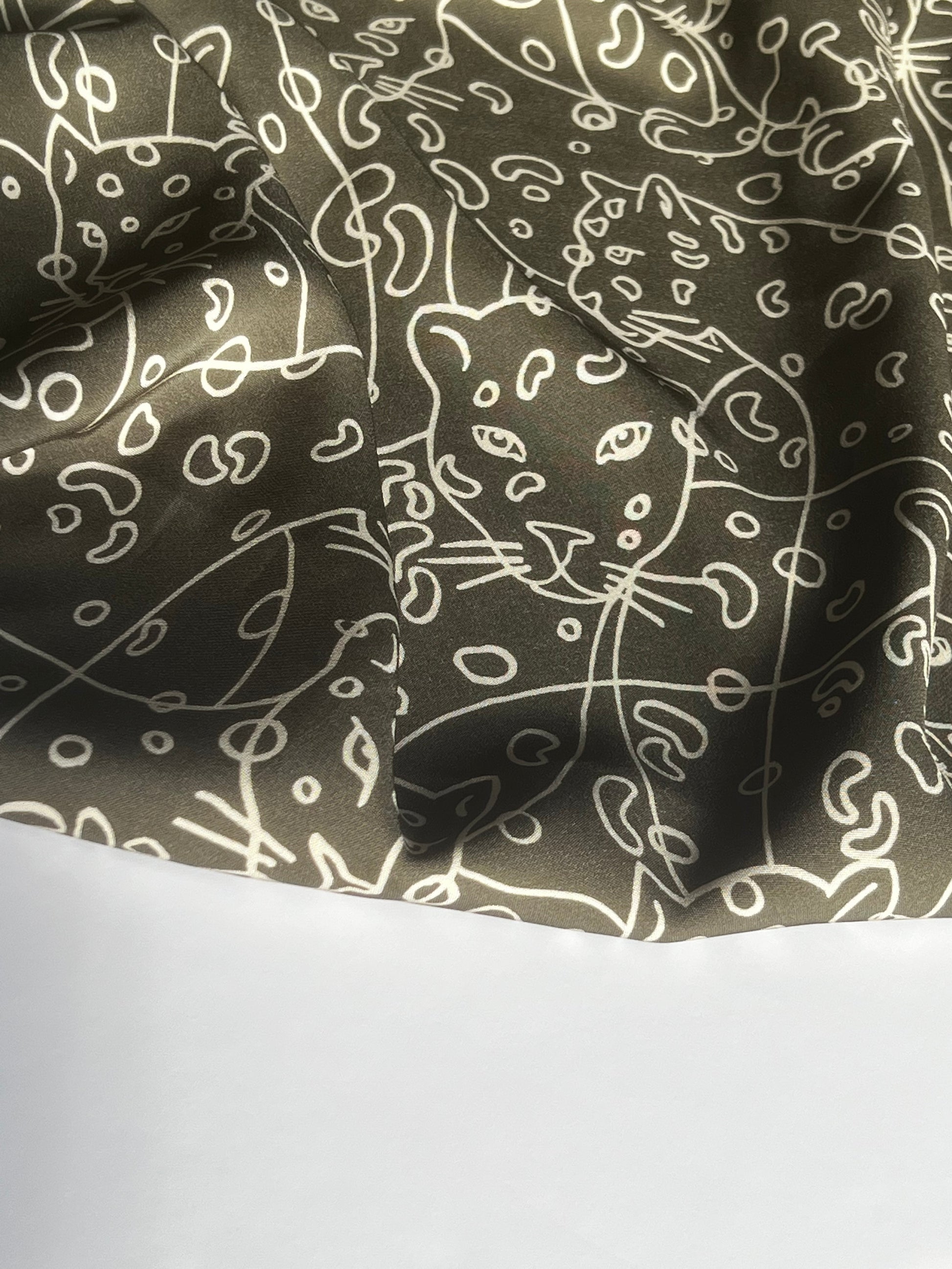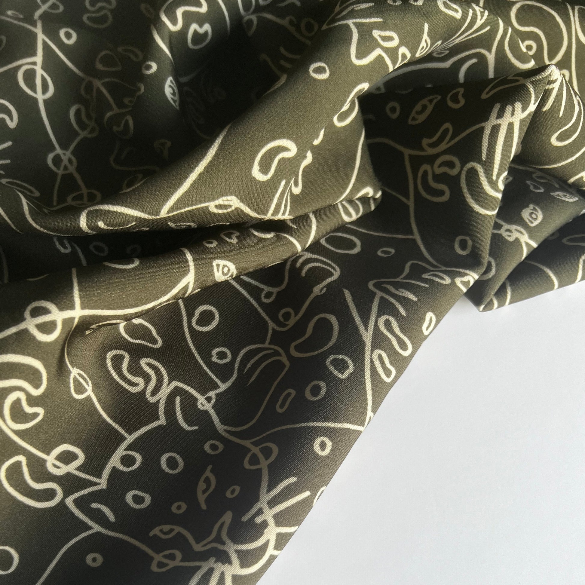 This is a lovely cotton and viscose cady, is ideal for dress weight projects and trousers and a great transition piece as we go into the autumn months. The print is an unusual illusion of a wild cat, hidden in the pattern of wiggles and circles on a rich khaki green background, this will truly be a fun piece to sew because of its smooth texture, to wear and make your own.